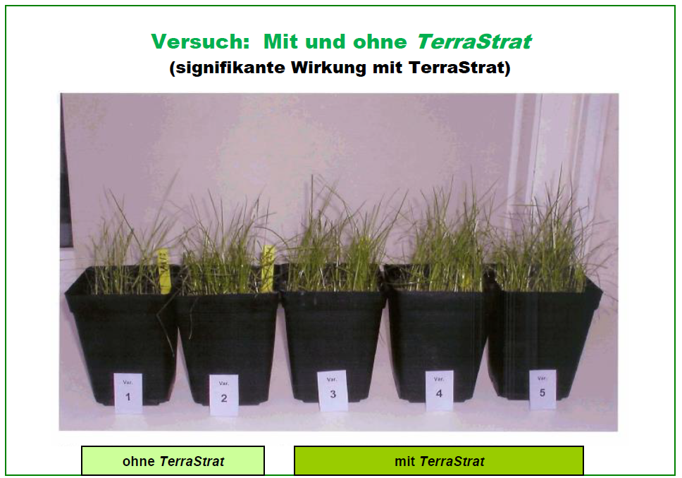Besonders bei sandigen Böden, oder bei Intensivkulturen (Gemüsebau) und bei Böden mit wenig organischem Anteil (z.B. Rasenflächen, Golfplätze), wirkt TerraStrat ideal als Ionenaustauscher und Wasserspeicher (Porenwasser für die Bodenmikroben). TerraStrat unterstützt und regelt die Nährstoffversorgung der Pflanzen. Die ausgewogene Zusammensetzung vom Produkt TerraStrat wirkt auf einen optimalen Stoffwechsel hin.